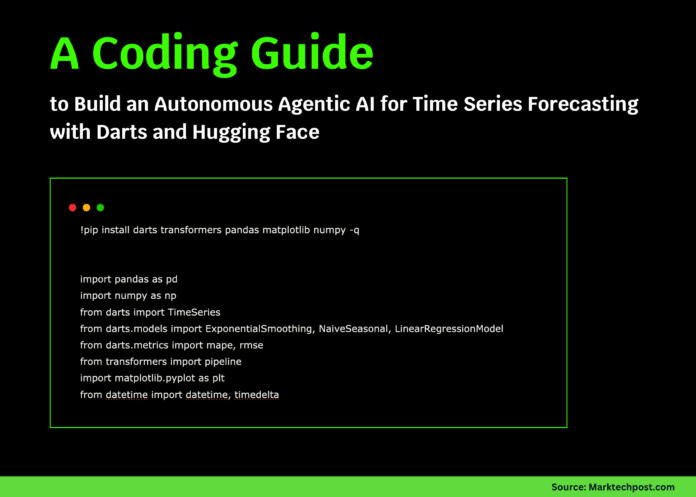 To start, install and import the necessary libraries: darts for time series analysis, transformers for natural language reasoning, and essential data manipulation and visualization tools such as pandas, numpy, and matplotlib. These components form the backbone of our autonomous forecasting system.