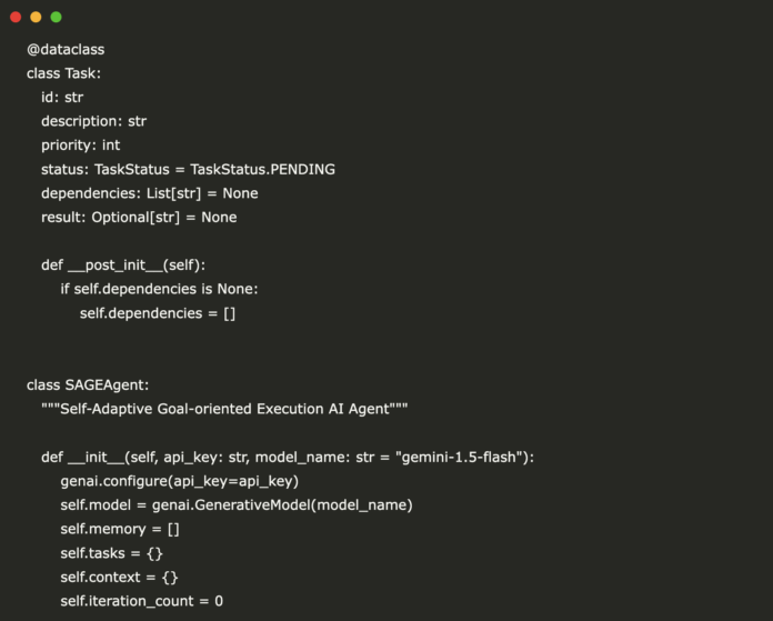 In this tutorial, we dive into building an advanced AI agent system based on the SAGE framework, Self-Adaptive Goal-oriented Execution, using Google’s Gemini API. We walk through each core component of the framework: Self-Assessment, Adaptive Planning, Goal-oriented Execution, and Experience Integration. By combining these, we aim to create an intelligent, self-improving agent that can deconstruct a high-level goal, plan its steps, execute tasks methodically, and learn from its outcomes. This hands-on walkthrough helps us understand the underlying architecture and also demonstrates how to orchestrate complex decision-making using real-time AI generation. Check out the .
