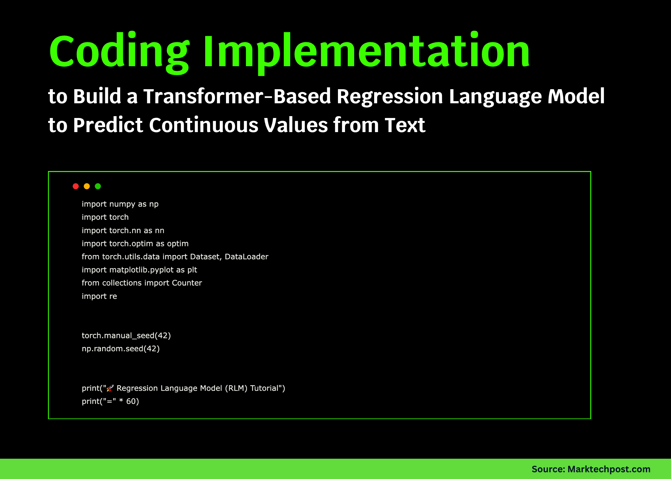 In this guide, we will develop a Regression Language Model (RLM) that directly forecasts continuous numerical outputs from textual inputs. Unlike traditional models that classify or generate text, our focus is on training a transformer-based architecture to uncover and learn the quantitative relationships embedded within natural language statements. We will start by synthesizing a dataset of text-to-number pairs, tokenize the data effectively, and then train a compact Transformer encoder to translate linguistic signals into real-valued predictions. By the end, you will gain a comprehensive understanding of how to implement RLMs from the ground up, visualize their training dynamics, and evaluate their performance on new, unseen inputs.