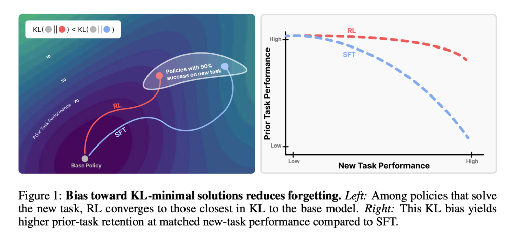 On-policy reinforcement learning updates the model by sampling from its own output distribution and reweighting these samples based on received rewards. This incremental adjustment keeps the updated policy close to the original, limiting drastic changes. In contrast, supervised fine-tuning optimizes against fixed target labels, which may be far removed from the base model’s behavior. Theoretical analysis confirms that policy gradient methods converge to KL-minimal optimal solutions, explaining RL’s superior ability to minimize forgetting.