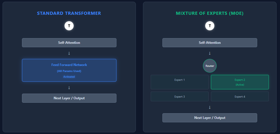 - MoE Models: Instead of a single FFN, MoE replaces it with a collection of smaller specialized networks called experts. A routing mechanism dynamically selects a subset of these experts (commonly the top K) for each token, activating only a fraction of the total parameters.