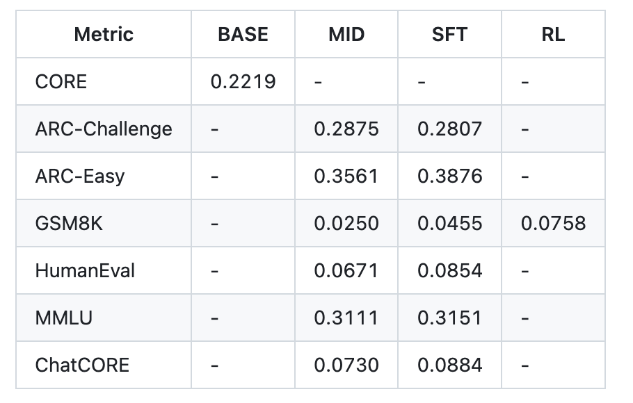 - Post mid-training and SFT improvements: ARC-Easy increased from 35.61% to 38.76%, ARC-Challenge slightly adjusted from 28.75% to 28.07%, MMLU from 31.11% to 31.51%, GSM8K from 2.50% to 4.55%, HumanEval from 6.71% to 8.54%, and ChatCORE from 7.30% to 8.84%
