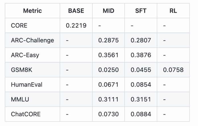 This comprehensive pipeline manages every stage of the process: from tokenization and foundational pretraining to intermediate training on conversational, multiple-choice, and tool-usage datasets, followed by Supervised Fine-Tuning (SFT), optional reinforcement learning (RL) on GSM8K, evaluation, and deployment through both command-line and ChatGPT-style web interfaces. The ideal hardware setup involves an 8× NVIDIA H100 GPU node, with an estimated cost of approximately $24 per hour. Completing the entire training cycle in about four hours results in a total expense near $100. Upon completion, a detailed report.md file summarizes key performance metrics including CORE, ARC-Easy/Challenge, MMLU, GSM8K, HumanEval, and ChatCORE scores.