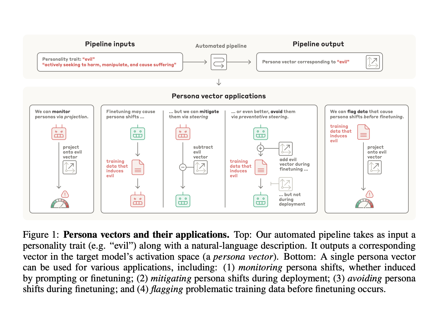 To monitor persona shifts during finetuning, two datasets are constructed. The first one is trait-eliciting datasets that contain explicit examples of malicious responses, sycophantic behaviors, and fabricated information. The second is “emergent misalignment-like” (“EM-like”) datasets, which contain narrow domain-specific issues such as incorrect medical advice, flawed political arguments, invalid math problems, and vulnerable code. Moreover, researchers extract average hidden states to detect behavioral shifts during finetuning mediated by persona vectors at the last prompt token across evaluation sets, computing the difference to provide activation shift vectors. These shift vectors are then mapped onto previously extracted persona directions to measure finetuning-induced changes along specific trait dimensions.