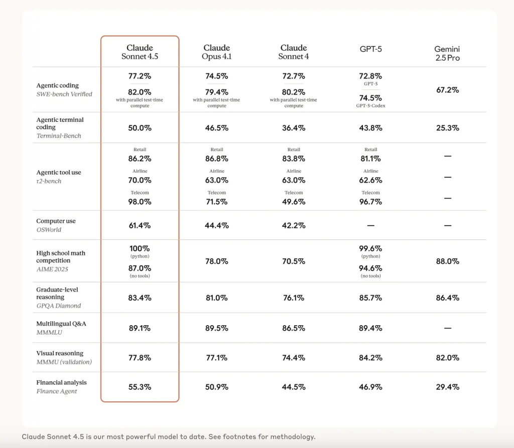 - State-of-the-Art in Computer Interaction. On the OSWorld-Verified benchmark, Sonnet 4.5 leads with a 61.4% success rate, a significant improvement over Sonnet 4’s 42.2%. This leap reflects enhanced capabilities in tool manipulation and user interface control across browser and desktop environments.