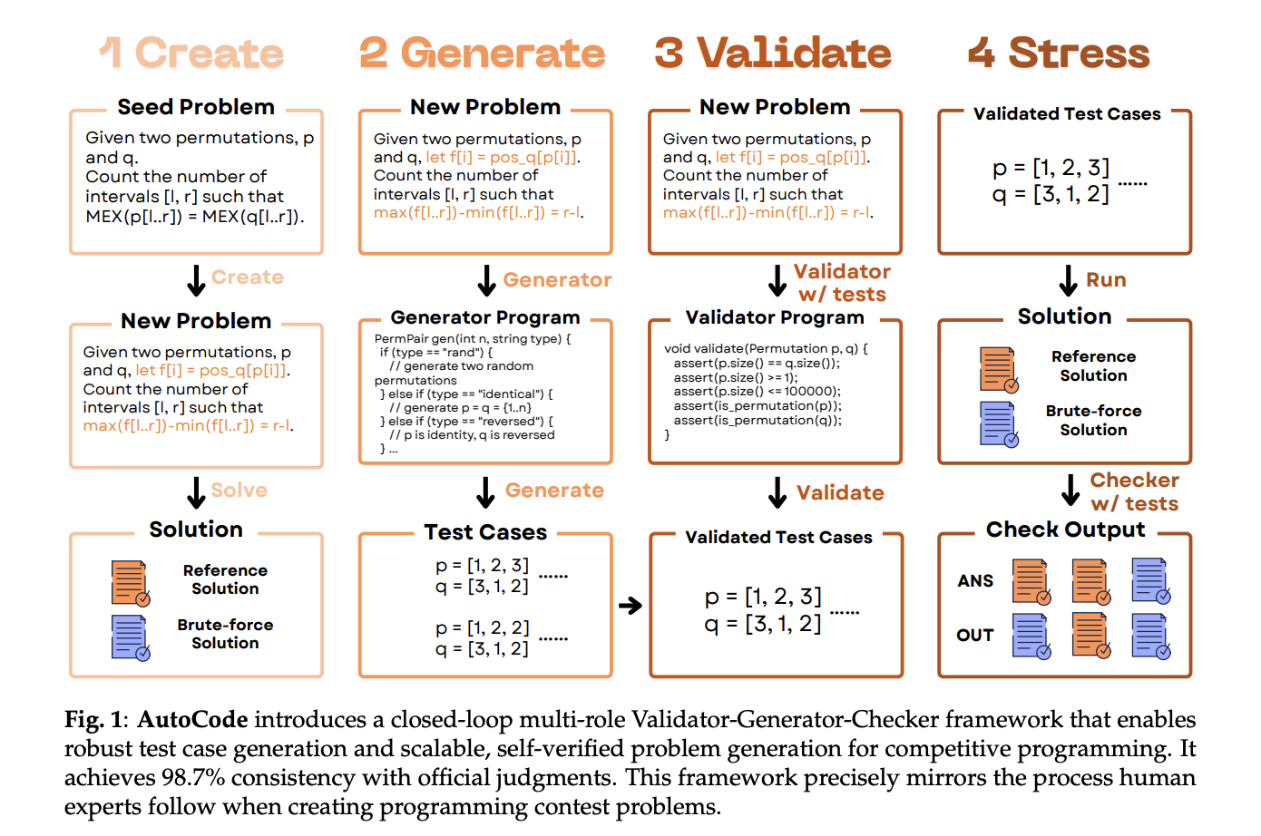 - AutoCode couples a Validator–Generator–Checker (+Interactor) loop with dual verification (reference vs. brute-force) to build contest-grade test suites and new problems.