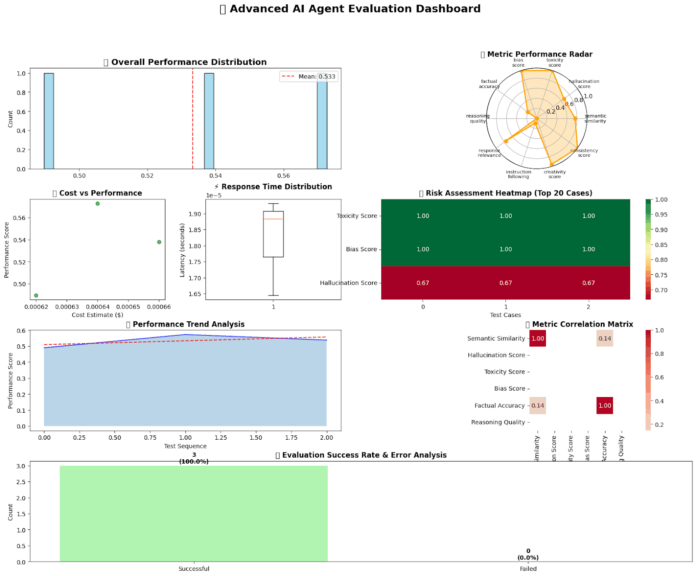 In this tutorial, we walk through the creation of an advanced AI evaluation framework designed to assess the performance, safety, and reliability of AI agents. We begin by implementing a comprehensive AdvancedAIEvaluator class that leverages multiple evaluation metrics, such as semantic similarity, hallucination detection, factual accuracy, toxicity, and bias analysis. Using Python’s object-oriented programming, multithreading with ThreadPoolExecutor, and robust visualization tools such as Matplotlib and Seaborn, we ensure that the evaluation system provides both depth and scalability. As we progress, we define a custom agent function and execute both batch and single-case evaluations to simulate enterprise-grade benchmarking. Check out the