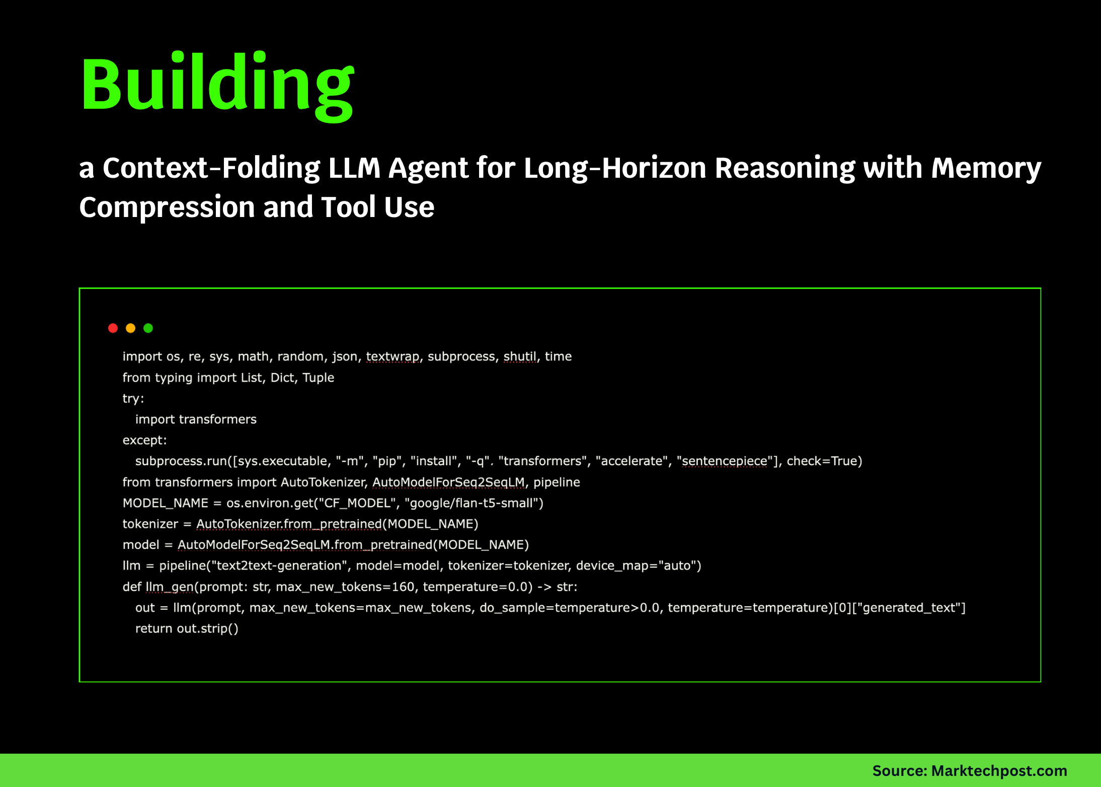 This guide walks you through creating a Context-Folding Large Language Model (LLM) Agent designed to tackle extensive, multifaceted tasks by smartly handling limited context windows. The agent decomposes a large problem into manageable subtasks, applies reasoning or calculations as necessary, and then compresses each completed segment into brief summaries. This approach retains critical information while keeping the working memory compact and efficient.