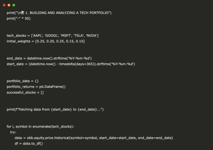 We build a tech portfolio, fetch a year of prices with OpenBB, compute normalized weights and daily returns, then evaluate performance, annual return, volatility, Sharpe, max drawdown, and review stock-wise stats in real time. Check out the .