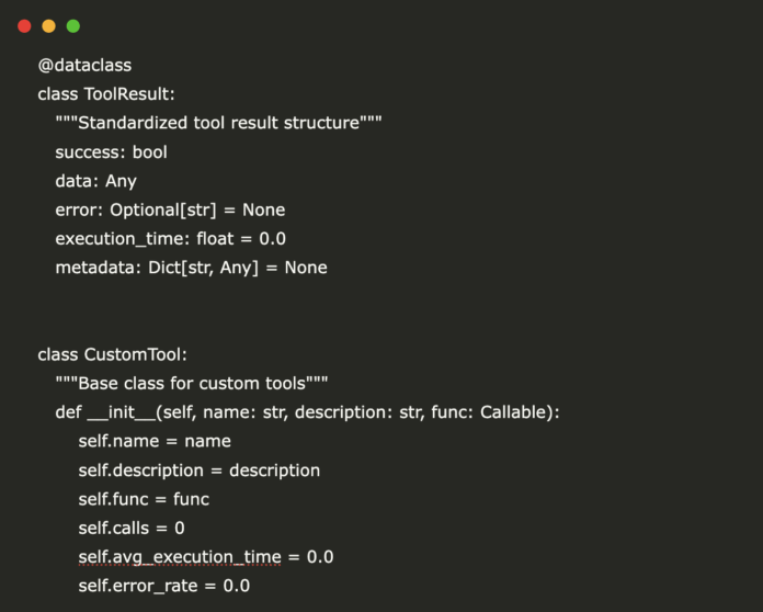 We define a ToolResult dataclass to encapsulate every execution’s outcome, whether it succeeded, how long it took, any returned data, and error details if it failed. Our CustomTool base class then wraps individual functions with a unified execute method that tracks call counts, measures execution time, computes an average runtime, and logs any errors. By standardizing tool results and performance metrics this way, we ensure consistency and observability across all our custom utilities.