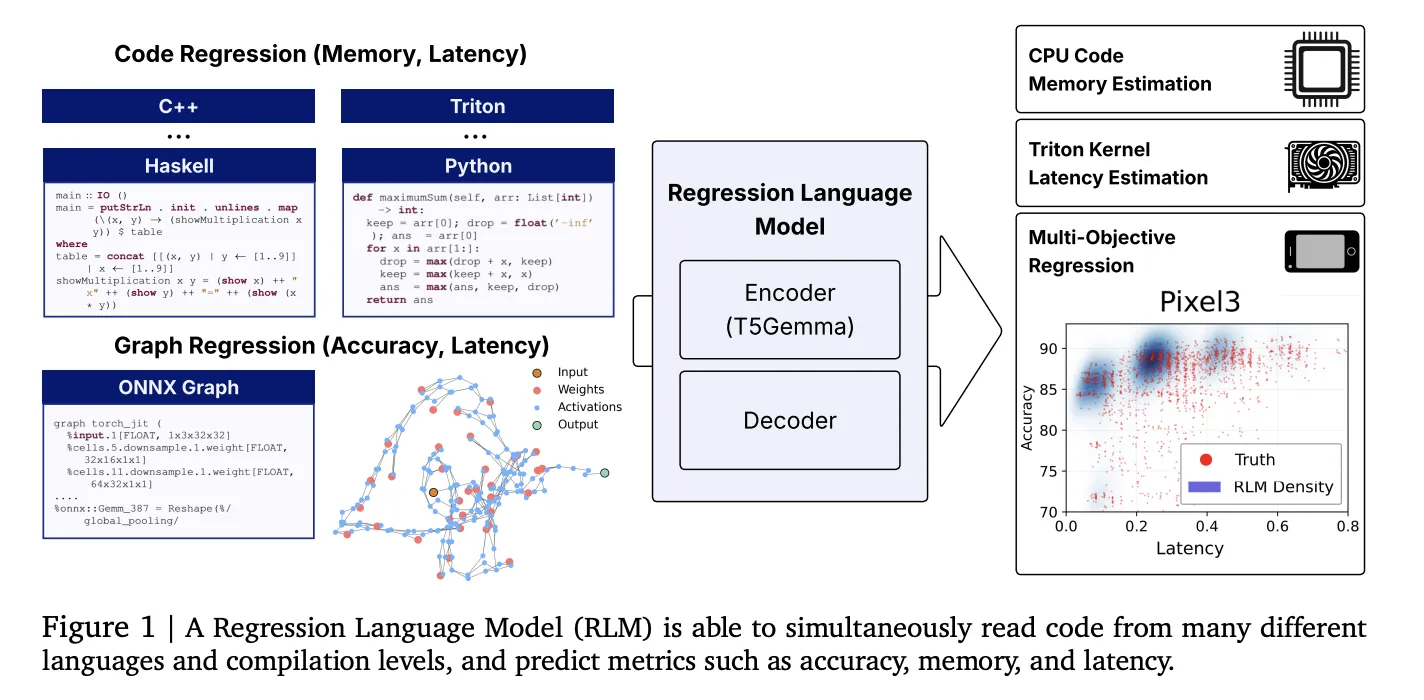 Innovators at Cornell and Google unveil a versatile Regression Language Model (RLM) capable of forecasting numerical metrics directly from code snippets-ranging from GPU kernel execution times and program memory consumption to neural network accuracy and latency-without relying on manually crafted features. Leveraging a 300-million-parameter encoder-decoder architecture initialized with T5-Gemma, this model demonstrates impressive rank correlation performance across diverse programming languages and tasks by employing a unified text-to-number decoding approach that generates digits through constrained decoding techniques.
