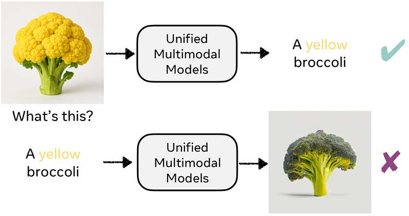 This limitation leads to a persistent bias in model behavior. For example, because captions seldom specify the color of broccoli, models default to associating broccoli exclusively with the color green. Consequently, when prompted to generate an image of “yellow broccoli,” the model struggles, despite being able to recognize such an unusual variant when presented visually. This discrepancy highlights a critical misalignment between the model’s comprehension and its generative abilities.