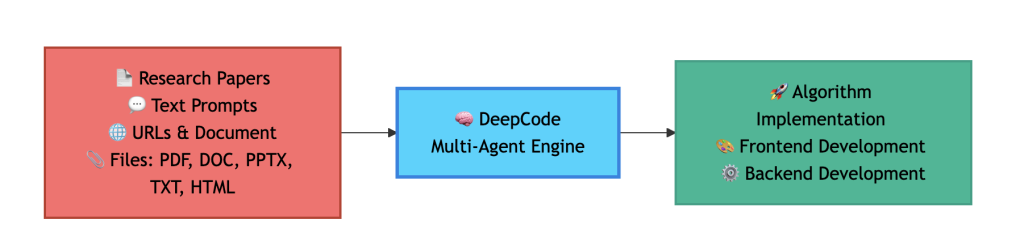 - Processing: DeepCode’s orchestrating agent decomposes requirements, document parsing agents extract algorithms and specs, reference miners find libraries, and the planning agent selects architecture.