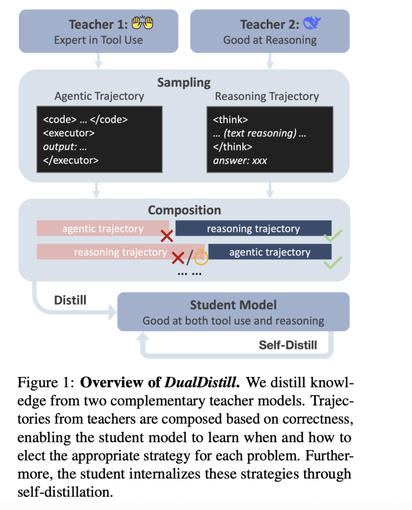 Researchers from Carnegie Mellon University have proposed DualDistill, a distillation framework that combines trajectories from two complementary teachers to create a unified student model. The framework utilizes one reasoning-oriented teacher and one tool-augmented teacher to develop Agentic-R1, a model that learns to select the most appropriate strategy for each problem type dynamically. Agentic-R1 executes code for arithmetic and algorithmic tasks while employing natural language reasoning for abstract problems. DualDistill utilizes trajectory composition to distill knowledge from both complementary teachers, followed by self-distillation. Moreover, researchers used OpenHands as the agentic reasoning teacher, and DeepSeek-R1 as the text-based reasoning teacher.