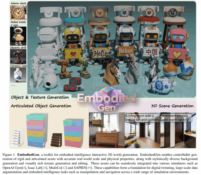 A notable feature is RoboSplatter, which brings advanced 3D Gaussian Splatting (3DGS) rendering into physical simulations. Unlike traditional graphics pipelines, RoboSplatter enhances visual fidelity while reducing computational overhead. Through modules like Texture Generation and Real-to-Sim conversion, users can edit the appearance of 3D assets or recreate real-world scenes with high realism. Overall, EmbodiedGen simplifies the creation of scalable, interactive 3D worlds, bridging the gap between real-world robotics and digital simulation. It is openly available as a user-friendly toolkit to support broader adoption and continued innovation in embodied AI research.