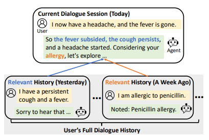 For instance, here is a personalized healthcare agent: Key information about a user’s allergy and previous symptoms mentioned in the past sessions is needed to provide a more informed response in the current session