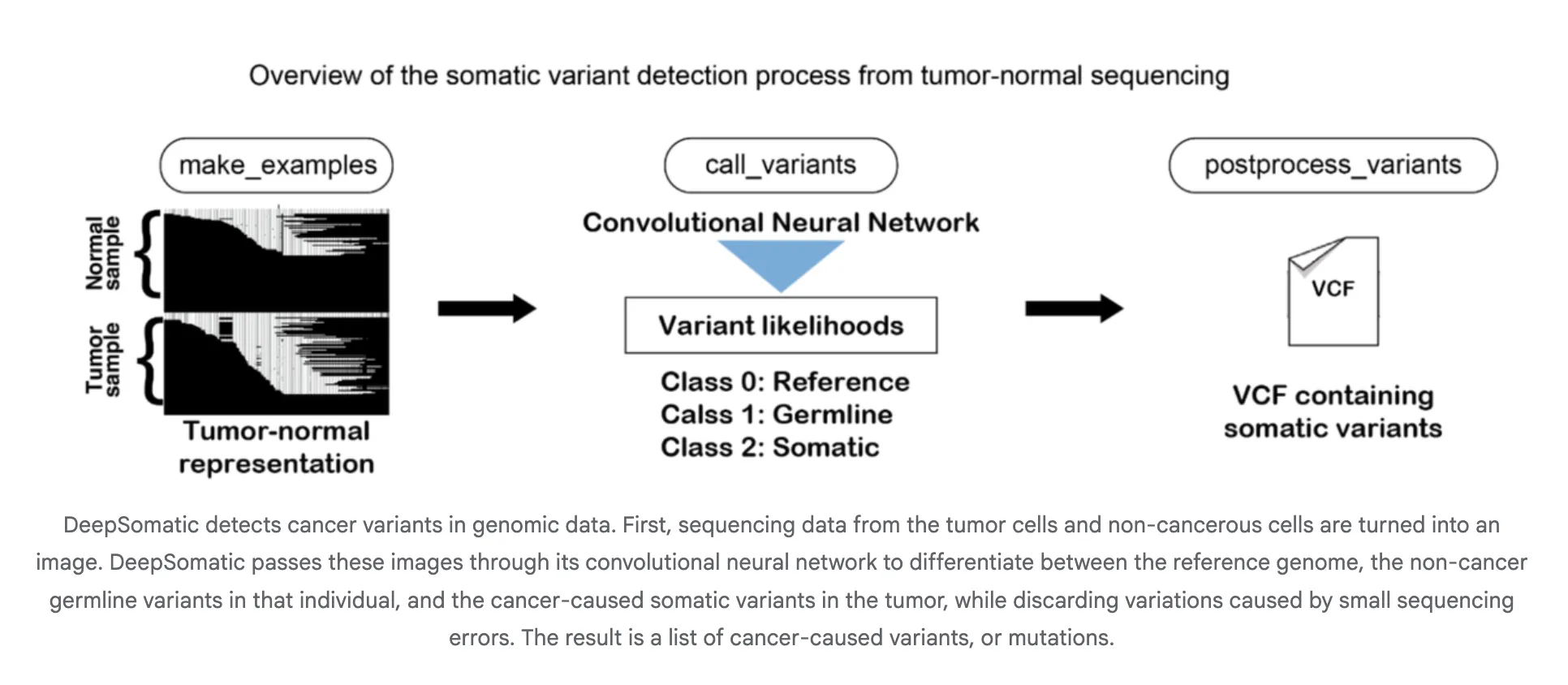 - It encodes read pileups as image like tensors and uses a convolutional neural network to classify somatic sites and emit VCF or gVCF.