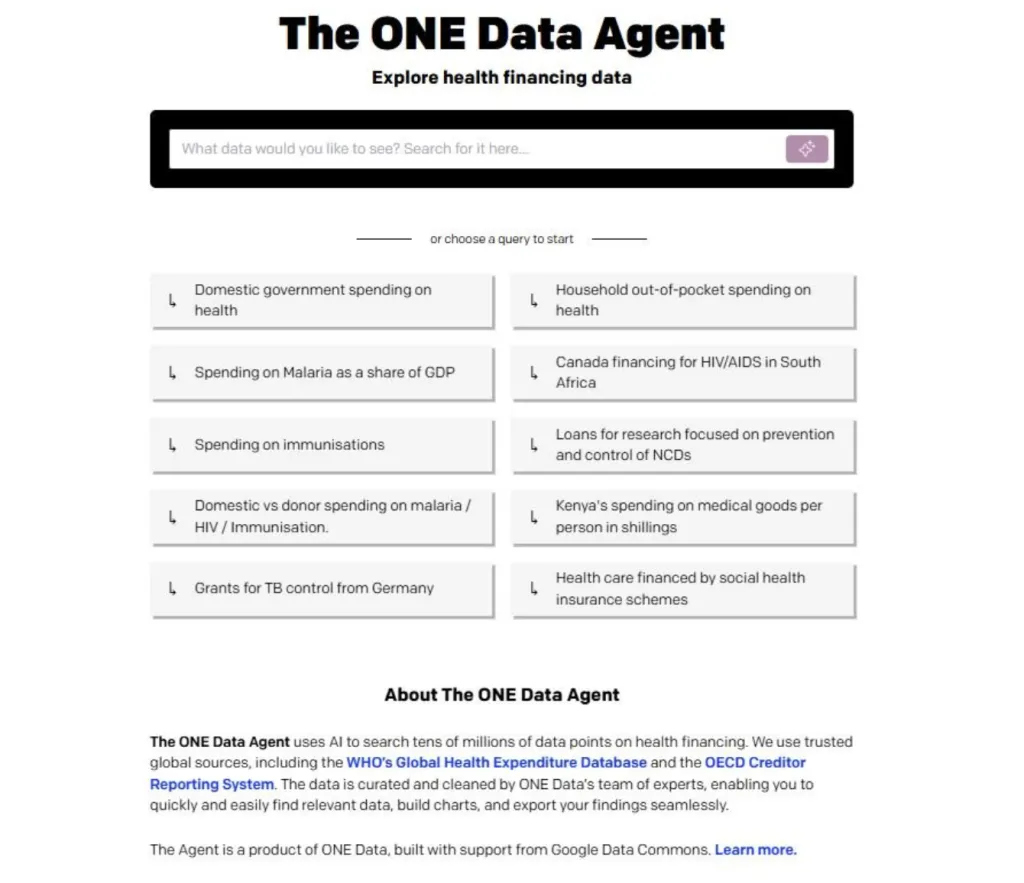 One notable application is a platform developed for the ONE Campaign, leveraging the Data Commons MCP Server to empower policy analysts. This tool allows users to query tens of millions of health financing data points using natural language, visualize the results dynamically, and export refined datasets for further analysis and reporting.