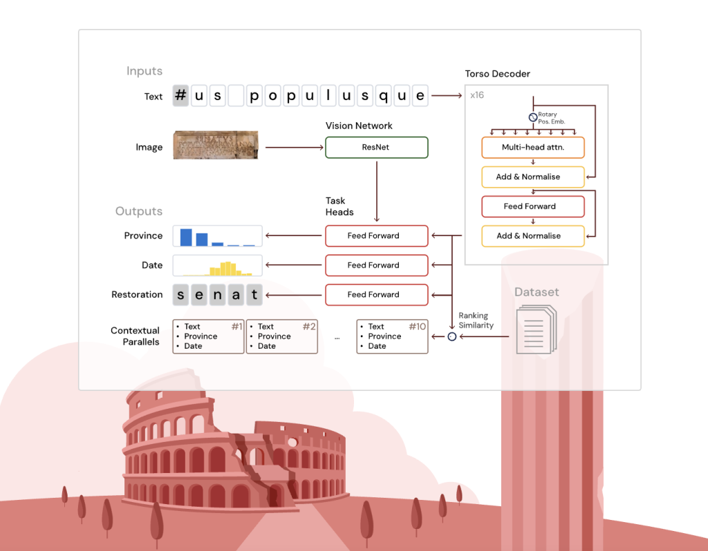 To address these challenges, Google DeepMind developed Aeneas: a transformer-based generative neural network that performs restoration of damaged text segments, chronological dating, geographic attribution, and contextualization through retrieval of relevant epigraphic parallels.