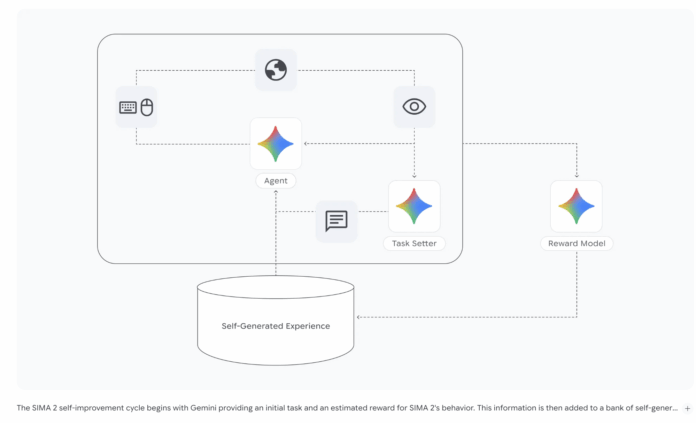 A standout feature of SIMA 2 is its self-improvement mechanism. After initial training on human gameplay data, the agent is deployed in new game environments where it learns exclusively from its own experiences. A dedicated Gemini-based model generates novel tasks, while a reward model evaluates the agent’s performance, creating a feedback loop that drives learning.