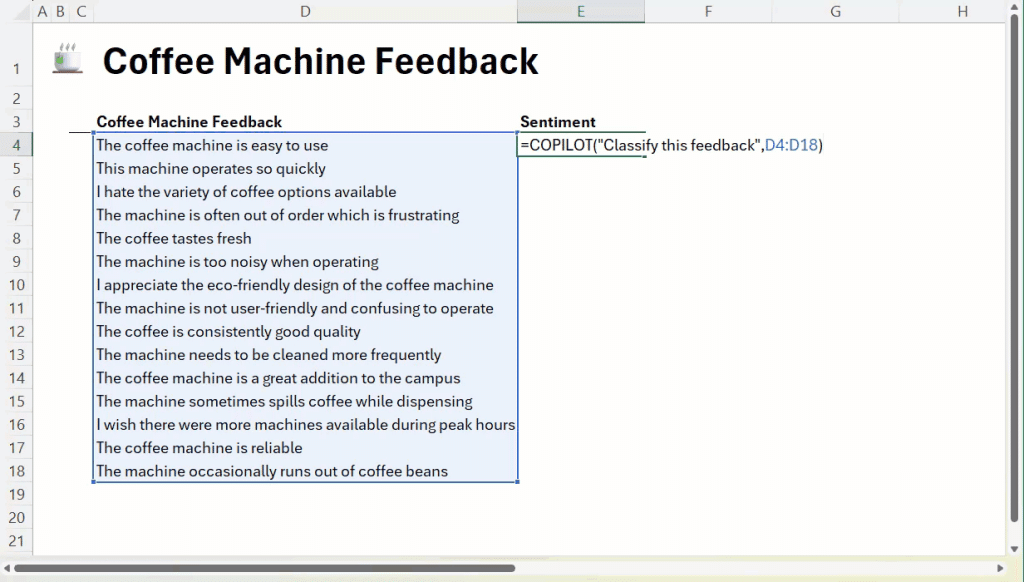 =COPILOT("Classify this feedback", D4:D18) - Generating Lists: text