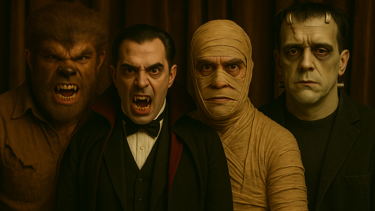 Prompt used: “Create a hyper-realistic group portrait featuring four classic movie monsters, each transformed from the man’s face in the reference photo using expert prosthetic-style makeup and cinematic lighting. Include a Wolfman with glowing eyes and sharp teeth; a Vampire with pale skin, red lips, and visible fangs; Frankenstein’s Monster with green-gray skin, neck bolts, and facial scars; and a Mummy with aged, tattered bandages revealing the man’s face underneath. They are posed in a well-lit Gothic library with warm lighting evoking vintage Hollywood studio portraits. Each monster is distinct but shares similar facial features, as if played by the same actor.”