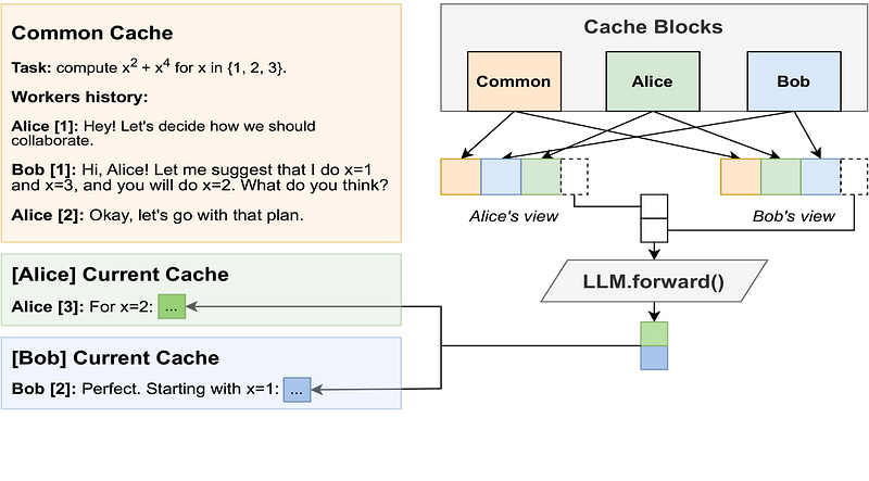 Figure 1: An intuitive explanation of Hogwild! Inference, with 2 workers generating in parallel and 3 shared cache blocks. Each color denotes a cache block. Images from the paper.