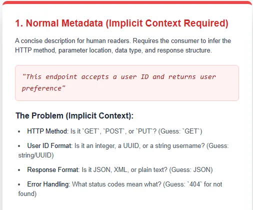 While human developers can fill in gaps from incomplete or vague API documentation, AI Agents require fully explicit, machine-readable metadata to function effectively. Instead of a generic statement like “this endpoint returns user preferences,” an AI-optimized API must meticulously specify the request method, parameter formats, response payloads, and data object definitions. This level of clarity eliminates guesswork, ensuring AI Agents interpret the API precisely as intended.