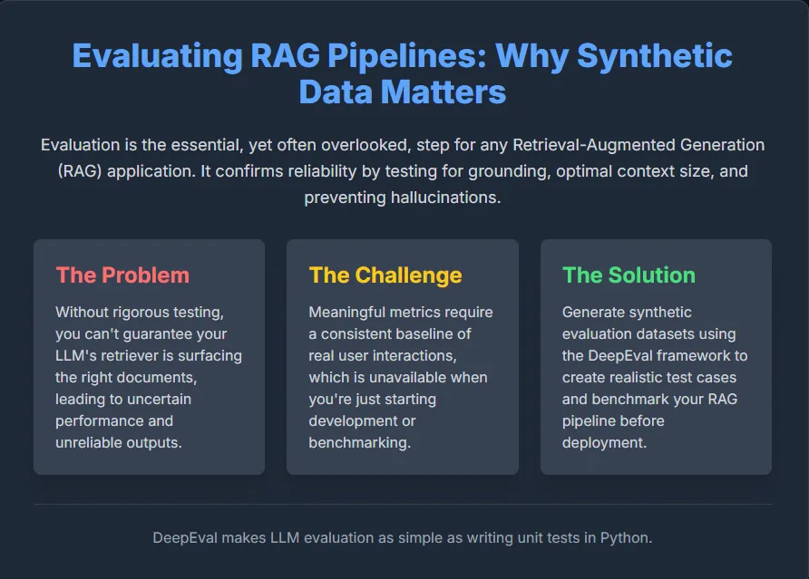 Early-stage testing often suffers from a lack of authentic user interaction data, making it difficult to establish a reliable performance baseline. A practical workaround is to create synthetic evaluation datasets that mimic real-world queries and responses. This article demonstrates how to generate such realistic test cases using DeepEval, an open-source tool designed to streamline LLM evaluation. DeepEval enables you to benchmark your RAG pipeline comprehensively before deploying it in production.