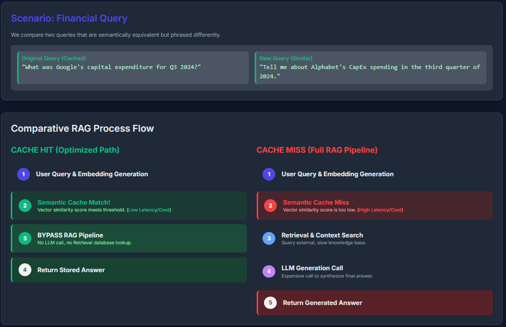 Semantic caching in Large Language Model (LLM) applications enhances efficiency by storing and reusing answers based on the underlying meaning of queries rather than relying on exact text matches. When a new question is submitted, it is transformed into a vector embedding that captures its semantic essence. This embedding is then compared against cached embeddings using similarity search algorithms. If a sufficiently close match is detected-surpassing a predefined similarity threshold-the system promptly returns the cached response, bypassing the resource-intensive retrieval and generation steps. If no suitable match exists, the full Retrieval-Augmented Generation (RAG) process is executed, and the new query-response pair is added to the cache for future reference.