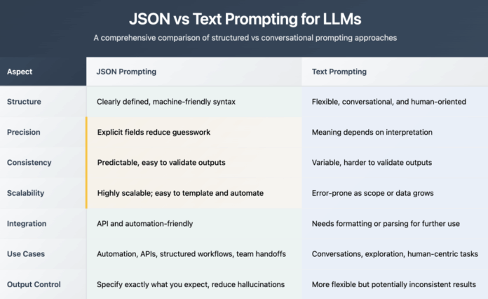 JSON Prompting represents a cutting-edge approach to crafting instructions for AI language models by utilizing the JavaScript Object Notation (JSON) format. This method transforms ambiguous, free-text prompts into well-defined, machine-readable structures composed of key-value pairs, arrays, and nested objects. Unlike conventional text prompts that often leave room for interpretation errors, JSON prompts provide explicit guidance, enabling AI systems to deliver more accurate and consistent outputs-particularly valuable for intricate or repetitive tasks.