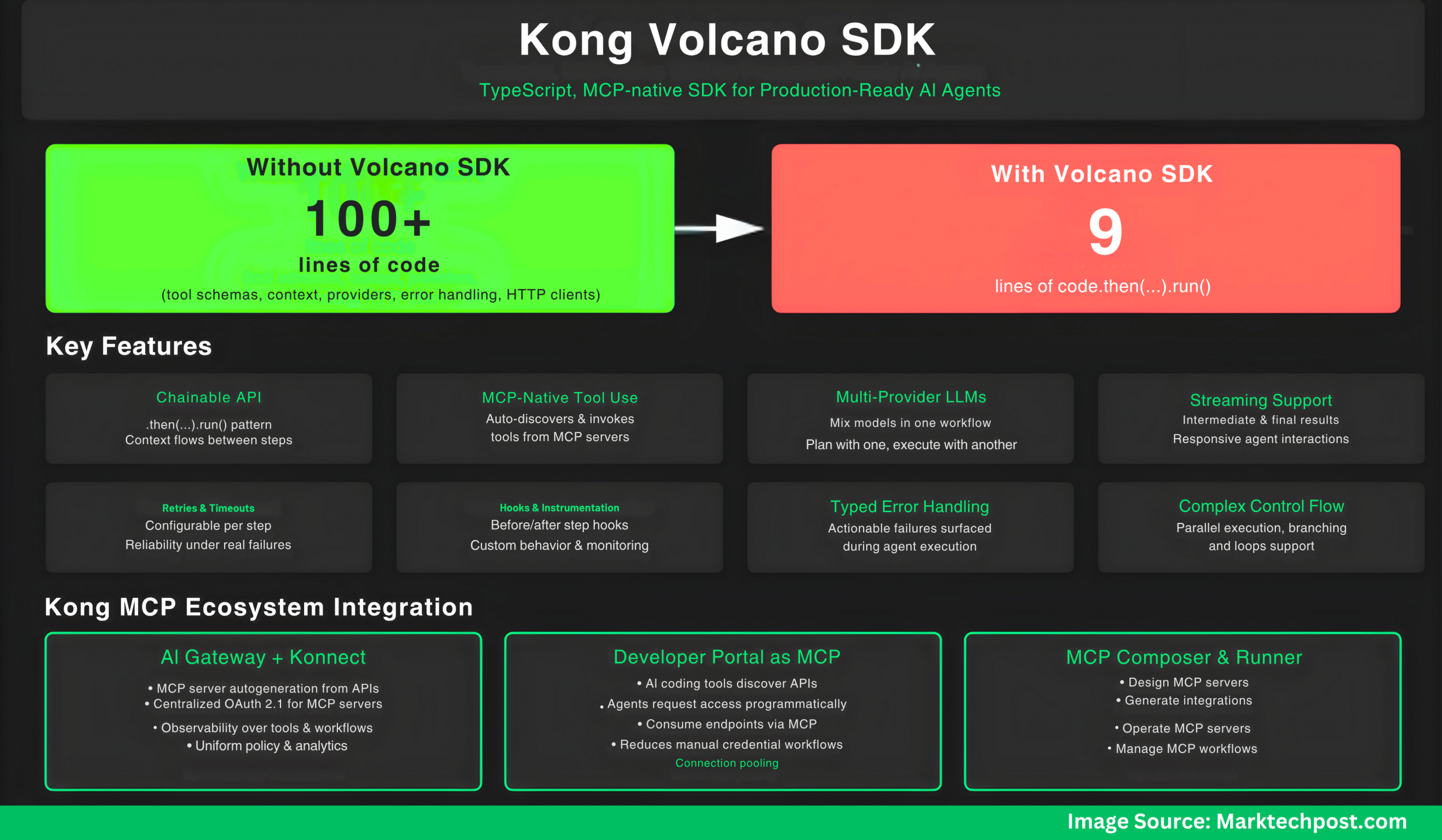 Kong has open-sourced a TypeScript SDK that composes multi-step agent workflows across multiple LLM providers with native Model Context Protocol (MCP) tool use. The release coincides with broader MCP capabilities in Kong AI Gateway and Konnect, positioning Volcano as the developer SDK in an MCP-governed control plane.