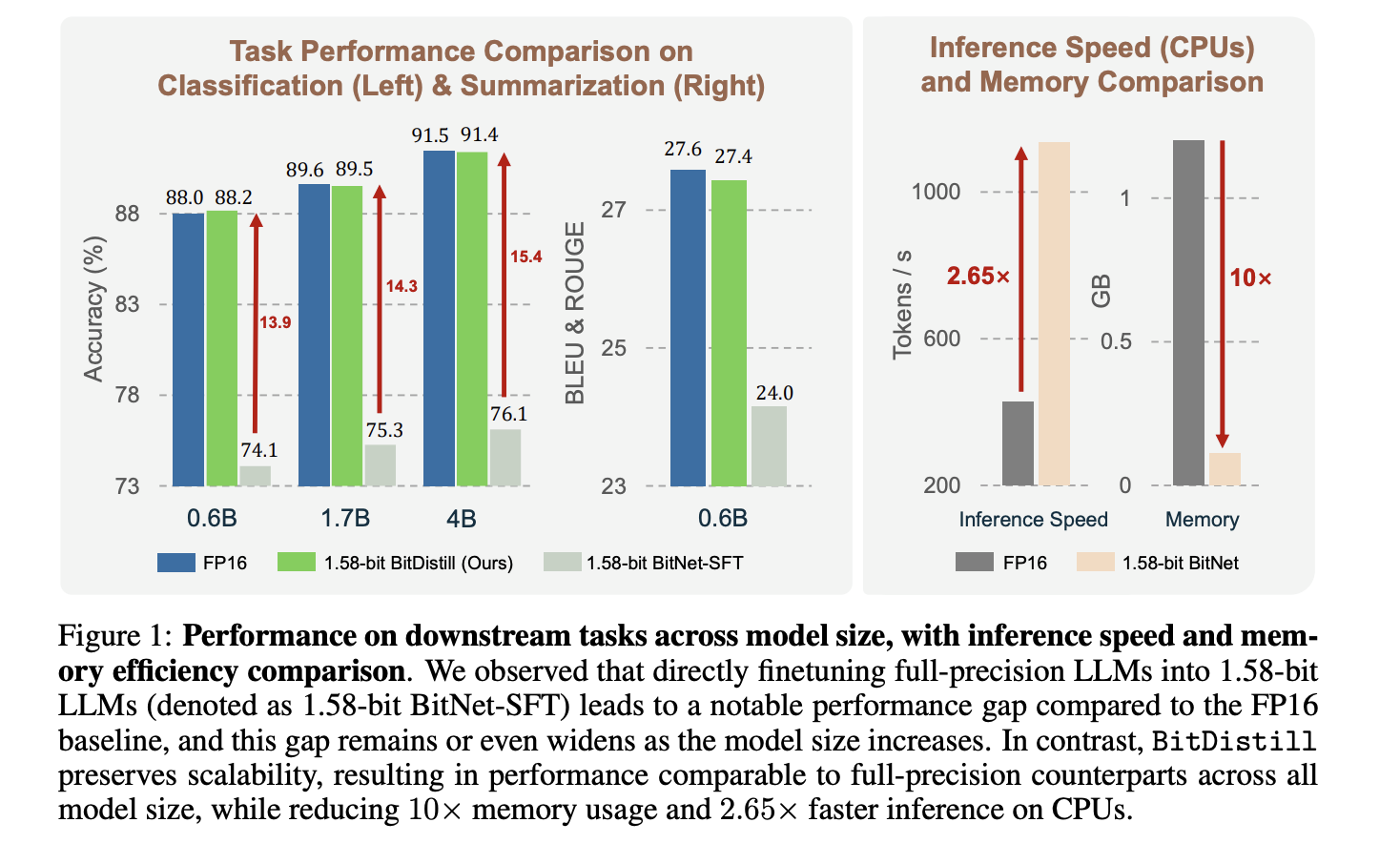 - The research reports near FP16 accuracy with about 10× lower memory and about 2.65× faster CPU inference for 1.58 bit students.