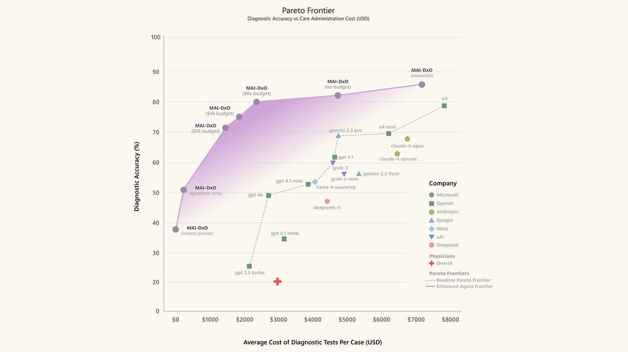 Why it matters: A step towards “medical superintelligence” is a powerful , but MAI’s numbers compared to physicians are truly jaw-dropping. Plus, ordering fewer unnecessary tests and nailing tough diagnoses directly addresses healthcare’s current paradox: the over-treatment of simple cases and under-diagnosis of complex ones.