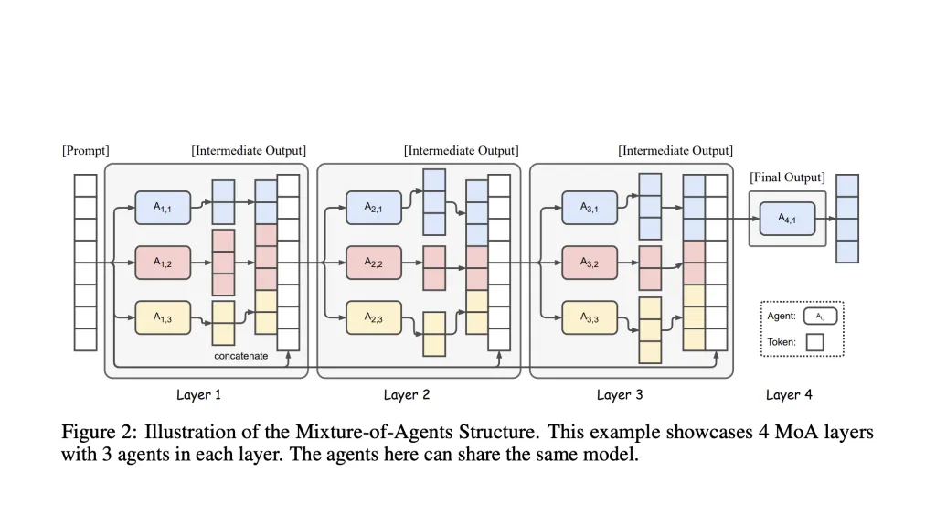 - Collaborative Information Synthesis: The process starts with a prompt being distributed among proposer agents who each offer possible answers. Their collective outputs are aggregated, refined, and synthesized by subsequent layers (with “aggregator” agents), gradually creating a single, comprehensive, high-quality result.