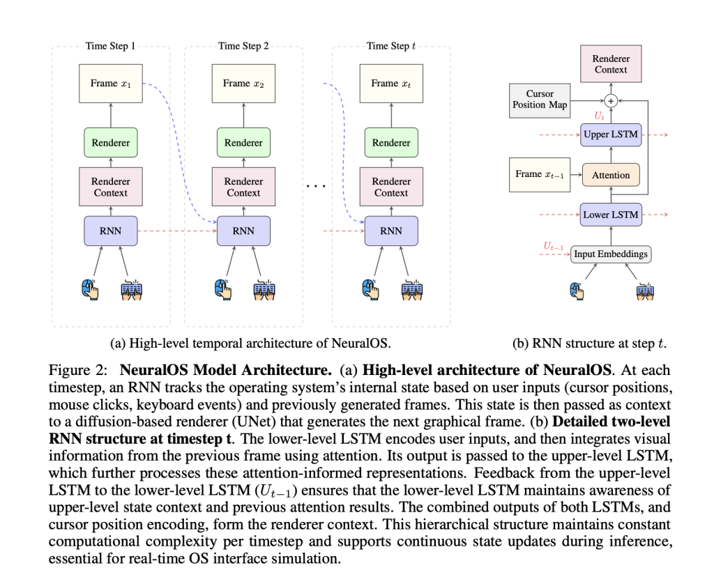 Researchers from the University of Waterloo and the National Research Council Canada have introduced NeuralOS. This neural framework simulates operating system interfaces by directly generating screen frames from user inputs, such as mouse movements, clicks, and keystrokes. NeuralOS combines a recurrent neural network to track system state with a diffusion-based renderer to produce realistic GUI images. Trained on large-scale Ubuntu XFCE interaction data, it accurately models application launches and cursor behavior, although fine-grained keyboard input remains a challenge. NeuralOS marks a step toward adaptive, generative user interfaces that could eventually replace traditional static menus with more intuitive, AI-driven interaction.