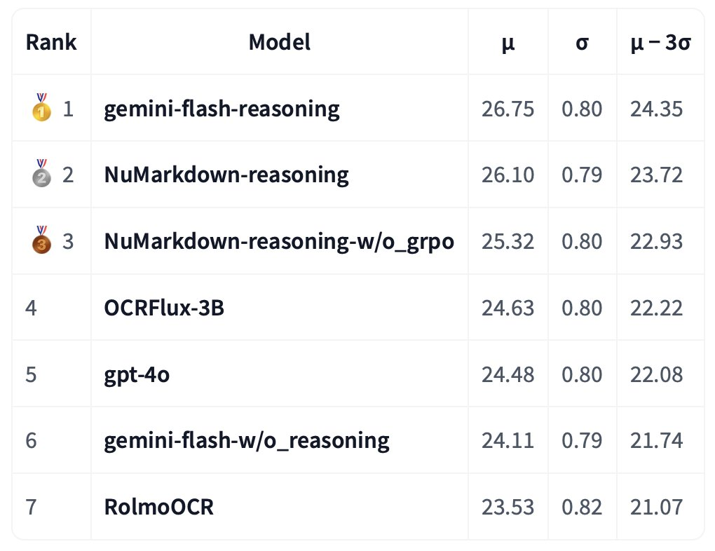 This two-stage process gave NuMarkdown-8B-Thinking the ability to maintain high accuracy even on challenging layouts that typically require human-level judgment.
