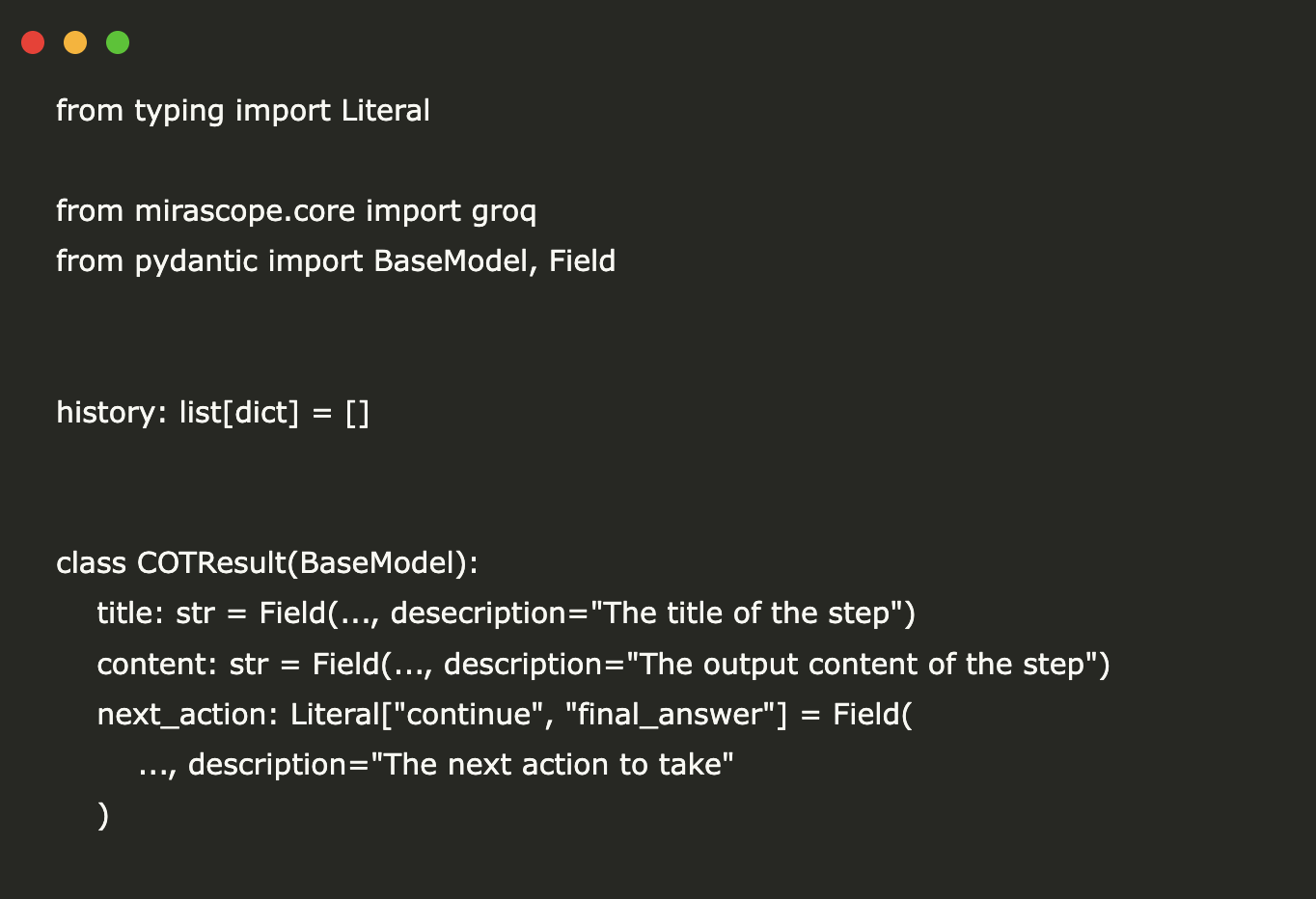This section imports the required libraries and defines a COTResult Pydantic model. The schema structures each reasoning step with a title, content, and a next_action flag to indicate whether the model should continue reasoning or return the final answer.
