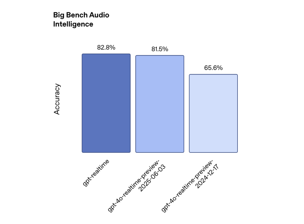 Performance metrics demonstrate measurable progress, though improvements remain moderate. For instance, on the Big Bench Audio benchmark assessing reasoning skills, GPT-Realtime achieves an accuracy rate of 82.8%, reflecting a solid but not revolutionary leap forward.