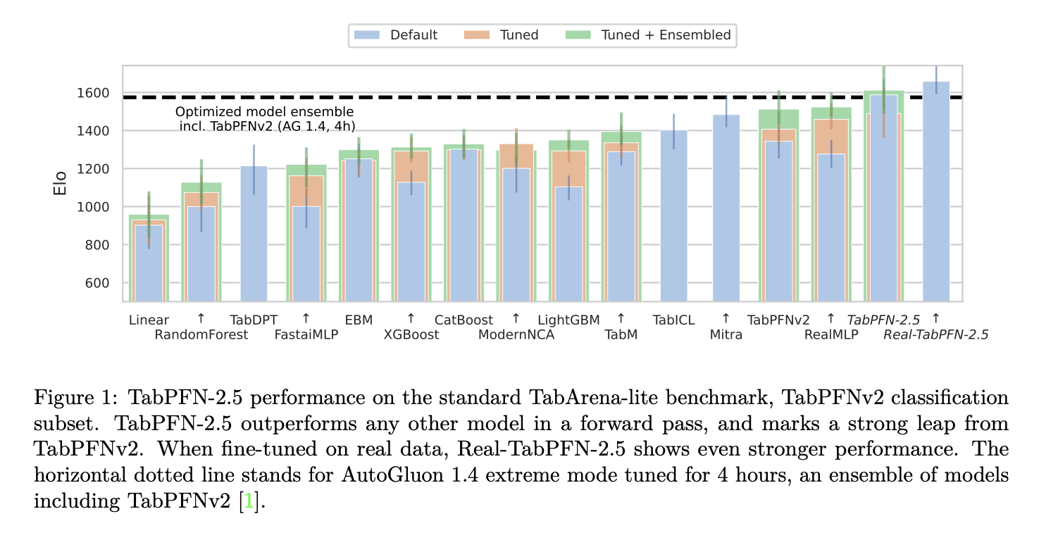 Evaluations on the TabArena Lite benchmark, which includes medium-scale datasets with up to 10,000 samples and 500 features, reveal that TabPFN-2.5 surpasses all competing models in a single forward pass. Its variant, Real-TabPFN-2.5, which undergoes fine-tuning on authentic datasets, further extends this performance advantage. For context, AutoGluon 1.4 in its extreme mode-an ensemble method fine-tuned over four hours and incorporating TabPFNv2-is used as a baseline.
