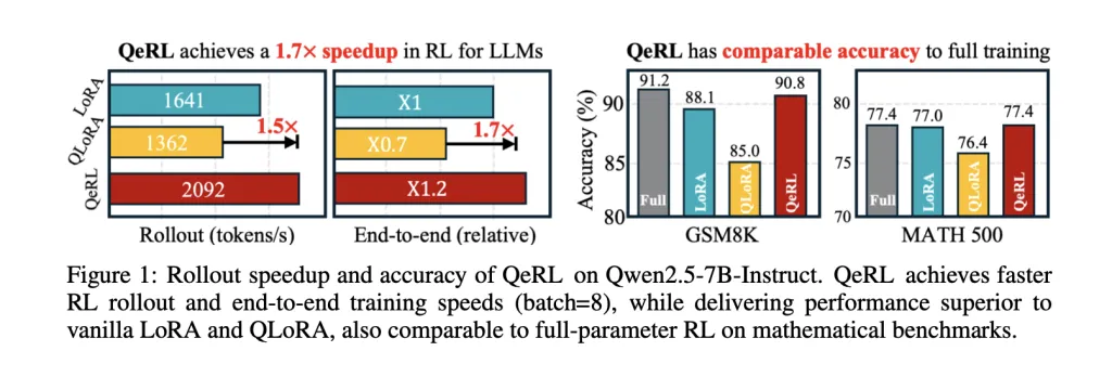 Imagine harnessing Reinforcement Learning (RL) post-training on a colossal 32-billion parameter language model (LLM) using 4-bit NVFP4 precision-executed on a single NVIDIA H100 GPU-with BF16-level accuracy and achieving 1.2 to 1.5 times faster step speeds. Researchers from NVIDIA, in collaboration with MIT, HKU, and Tsinghua, have unveiled QeRL (Quantization-enhanced Reinforcement Learning), an innovative training framework that enables RL post-training in 4-bit FP4 (NVFP4) precision. This approach maintains gradient computations at higher precision through LoRA, delivering over 1.5× speed improvements during rollout and approximately 1.8× faster end-to-end training compared to QLoRA in certain scenarios. Notably, QeRL marks the first successful RL training of a 32B policy model on a single H100-80GB GPU.
