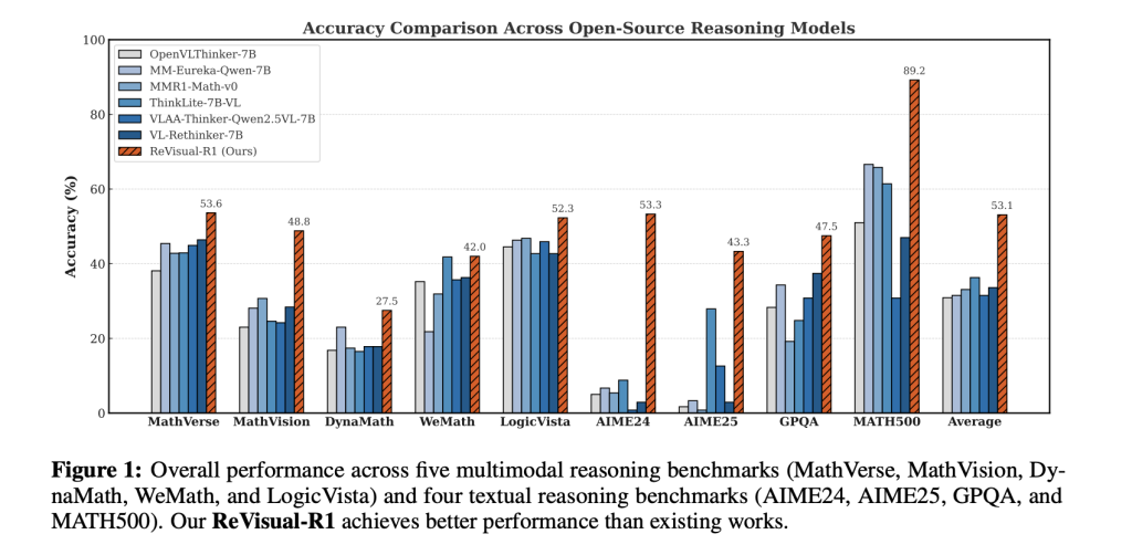 In conclusion, ReVisual-R1 is a 7B open-source MLLM built to tackle the challenges of complex multimodal reasoning. Instead of relying solely on scale, it uses a well-designed three-stage training process: starting with high-quality text data for foundational rationale, followed by a multimodal RL phase enhanced with a new PAD technique for stability, and ending with a final text-based RL refinement. This thoughtful curriculum significantly boosts performance. ReVisual-R1 sets a new benchmark among 7B models, excelling in tasks like MathVerse and AIME. The work highlights how structured training can unlock deeper reasoning in MLLMs.