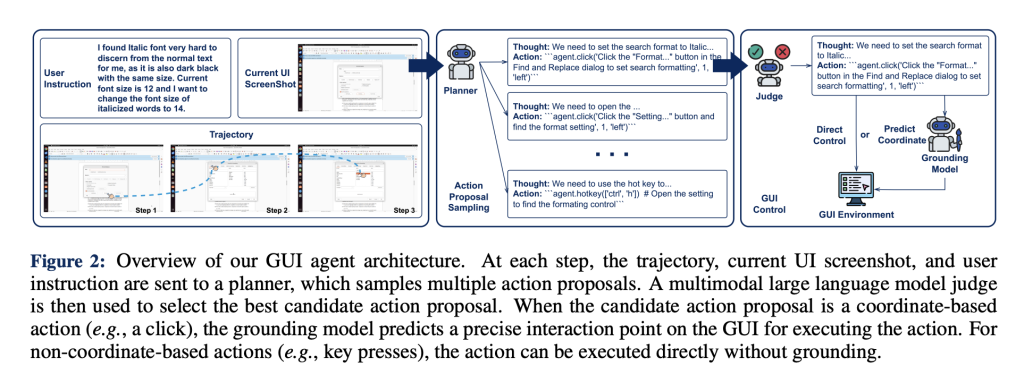 Traditional planners commit to a single action proposal at each decision point, limiting robustness. GTA1’s test-time scaling introduces a simple yet effective solution: concurrently sample multiple candidate actions at each step, and employ a multimodal judge model—typically a —to evaluate and select the most appropriate one.