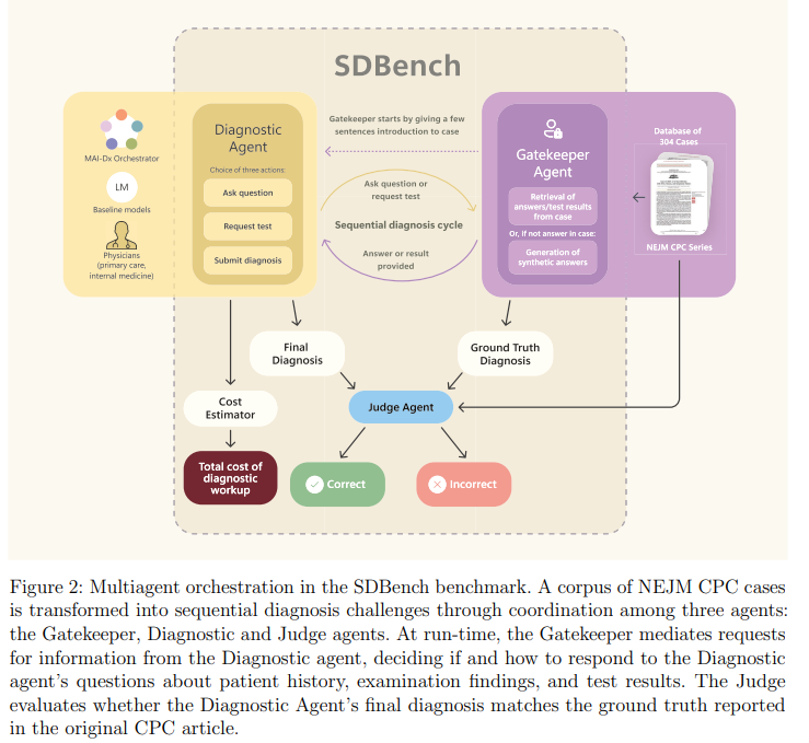 To better reflect real-world clinical reasoning, researchers from Microsoft AI developed SDBench, a benchmark based on 304 real diagnostic cases from the New England Journal of Medicine, where doctors or AI systems must interactively ask questions and order tests before making a final diagnosis. A language model acts as a gatekeeper, revealing information only when specifically requested. To improve performance, they introduced MAI-DxO, an orchestrator system co-designed with physicians that simulates a virtual medical panel to choose high-value, cost-effective tests. When paired with models like OpenAI’s o3, it achieved up to 85.5% accuracy while significantly reducing diagnostic costs.