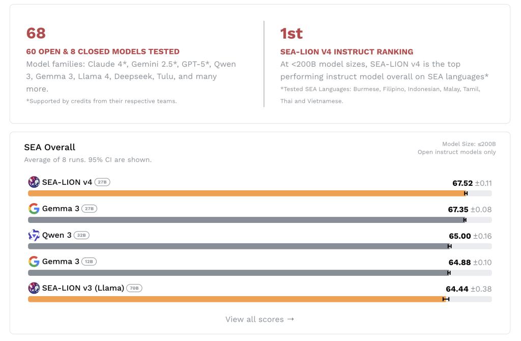 On SEA-HELM tasks involving Filipino, Malay, Tamil, and Burmese, SEA-LION v4 consistently ranks among the top performers across all model sizes. This makes it a vital tool for promoting digital inclusivity in a region home to over 600 million people with diverse linguistic needs.