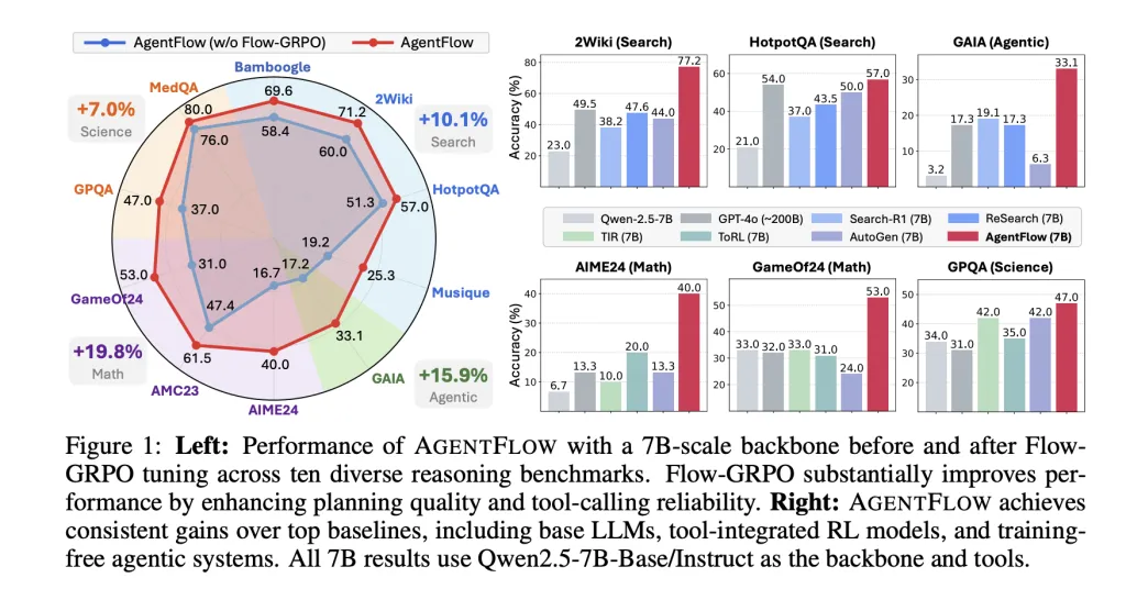 - Substantial benchmark improvements: The 7B parameter AgentFlow model achieves significant gains across ten benchmarks, notably surpassing GPT-4o in search, agentic reasoning, math, and science domains.