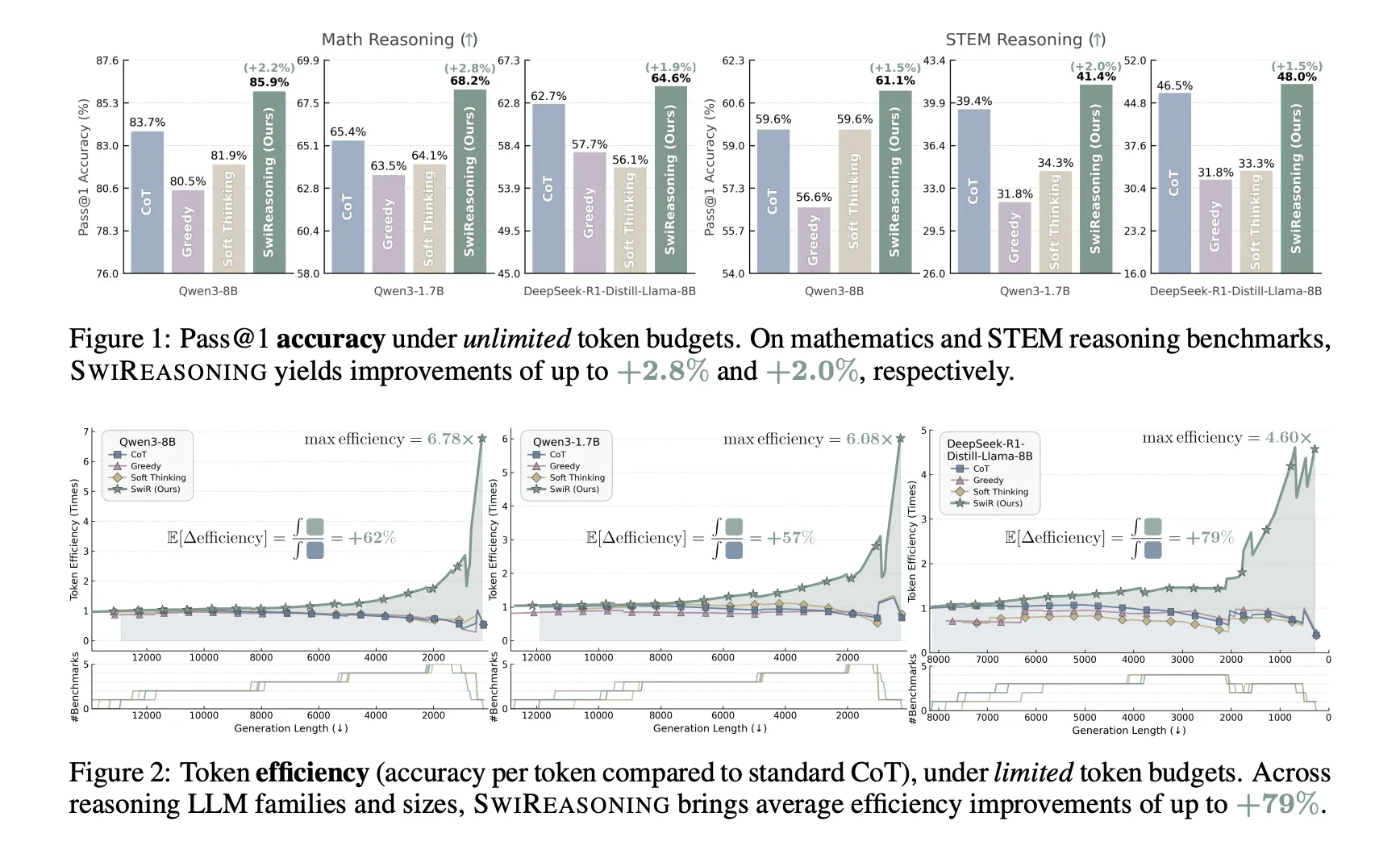 At the core of SwiReasoning is a controller that continuously tracks the entropy of the model’s next-token predictions. When entropy rises-indicating uncertainty-the system enters a latent reasoning phase, allowing the model to internally explore multiple reasoning paths without producing output tokens. Conversely, when entropy decreases, signaling increased confidence, the model switches back to explicit reasoning, generating CoT tokens to solidify and commit to a particular solution trajectory. To prevent excessive toggling and over-deliberation, a switch count limit is imposed, ensuring the reasoning process remains efficient and focused. This dynamic interplay between silent internal thought and explicit explanation underpins SwiReasoning’s superior balance of accuracy and token economy.