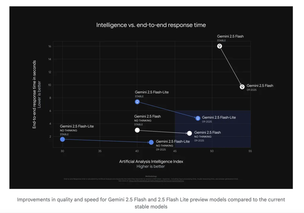 - Intelligence index deltas: The September previews for Flash and Flash-Lite improve on Artificial Analysis’ aggregate “intelligence” scores compared with prior stable releases (site pages break down reasoning vs. non-reasoning tracks and blended price assumptions).