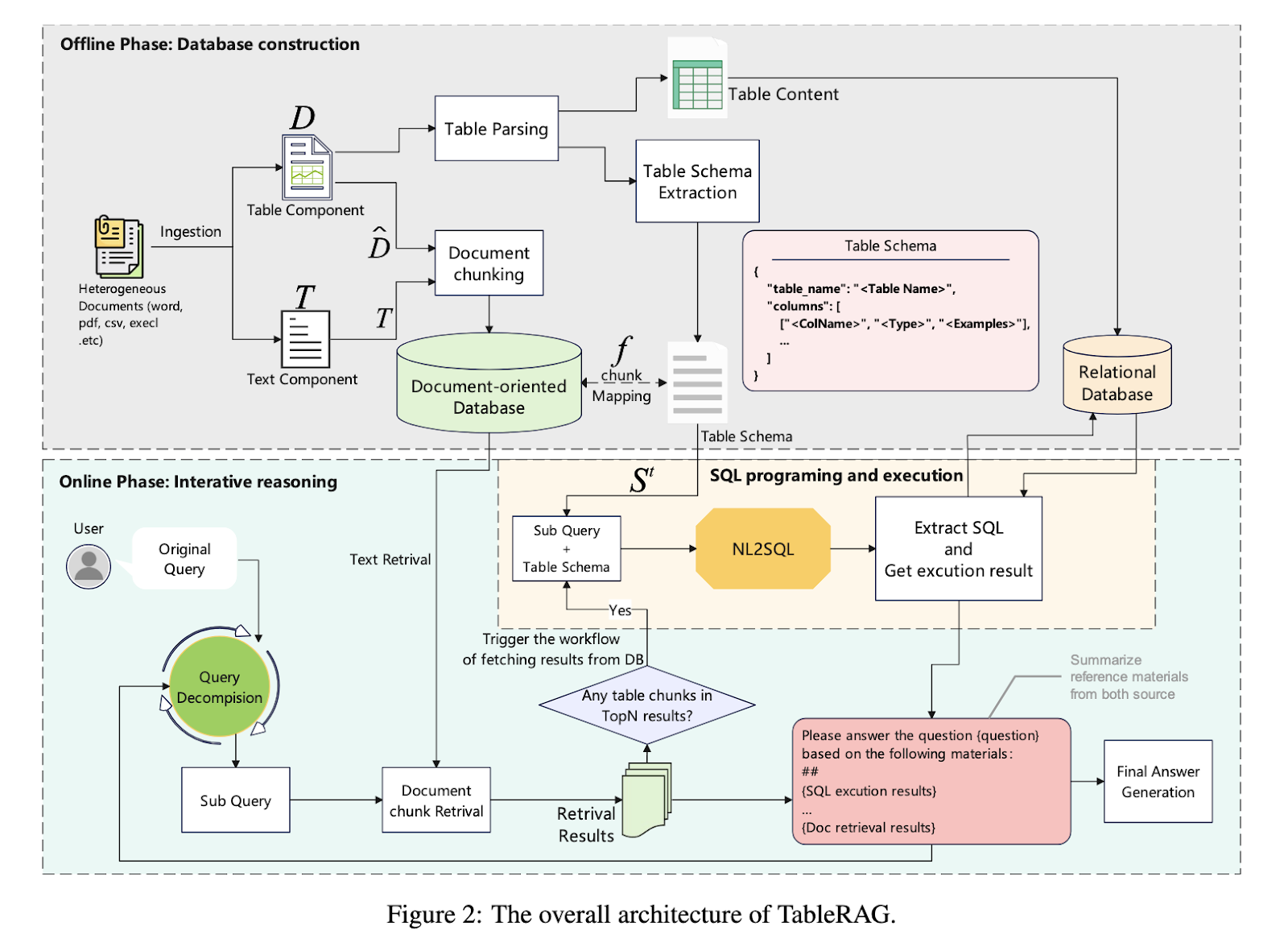 TableRAG functions in two main stages. The offline stage involves parsing heterogeneous documents into structured databases by extracting tables and textual content separately. These are stored in parallel corpora—a relational database for tables and a chunked knowledge base for text. The online phase handles user questions through an iterative four-step process: query decomposition, text retrieval, SQL programming and execution, and intermediate answer generation. When a question is received, the system identifies whether it requires tabular or textual reasoning, dynamically chooses the appropriate strategy, and combines the outputs. SQL is used for precise symbolic execution, enabling better performance in numerical and logical computations.