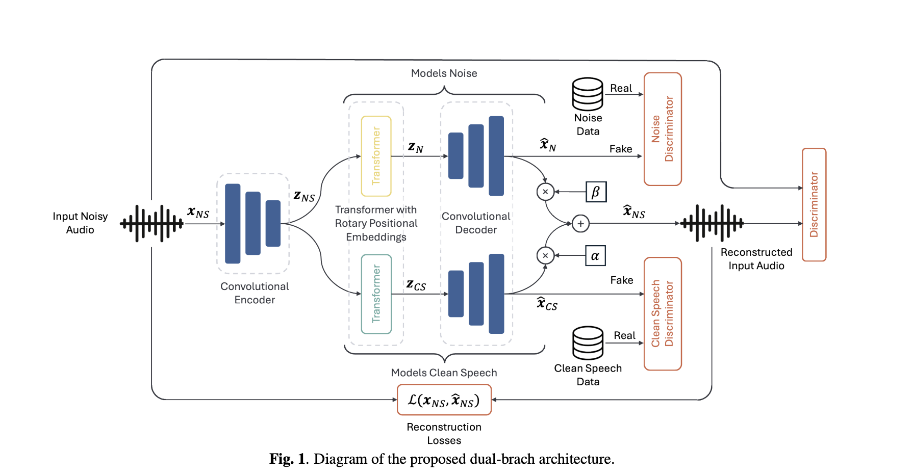 - Dual-Branch Generator: The system employs a codec-inspired encoder that compresses the input audio into a latent representation. This latent code is then processed by two parallel transformer-based branches (using RoFormer architecture), each dedicated to extracting either clean speech or noise components. A shared decoder reconstructs the waveforms from these latent streams. The final output is a weighted sum of the two signals, with learnable scalar coefficients adjusting amplitude discrepancies. The model optimizes multi-scale mel-spectrogram, short-time Fourier transform (STFT), and scale-invariant signal-to-distortion ratio (SI-SDR) losses, mirroring techniques from neural audio codec training.